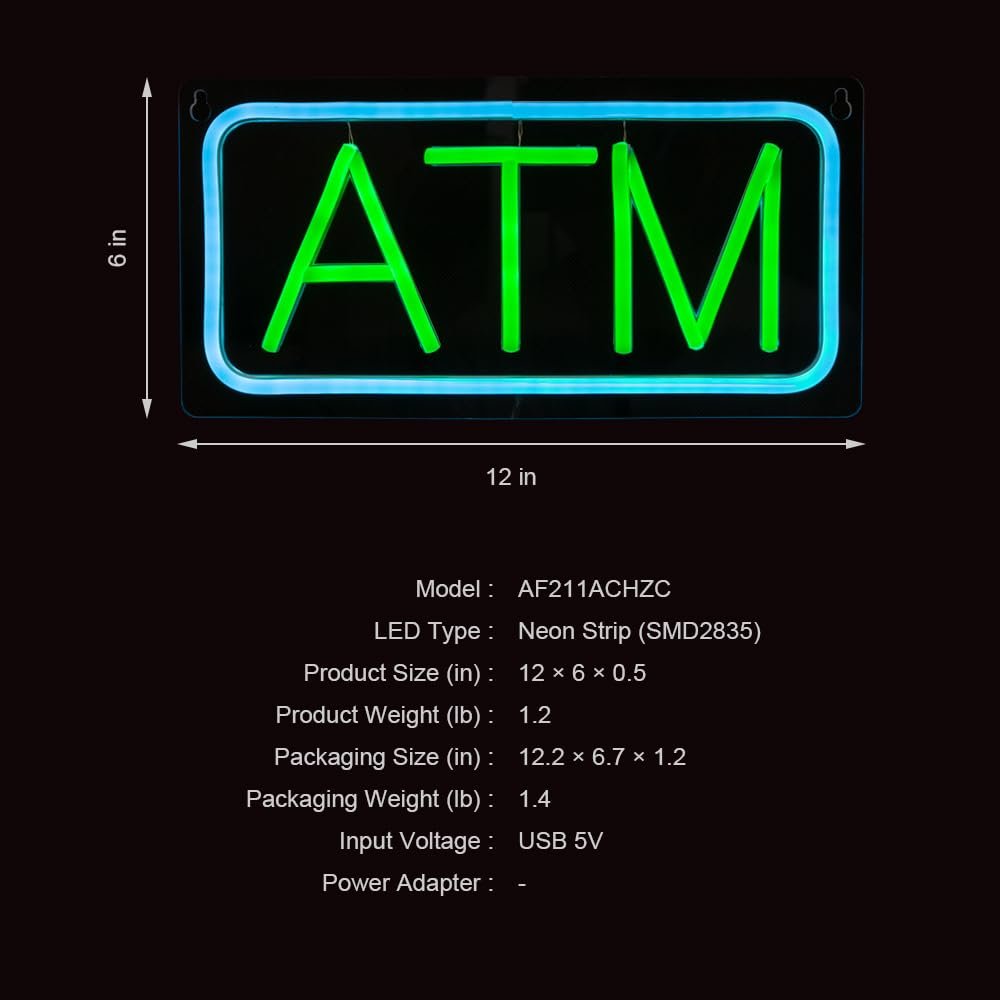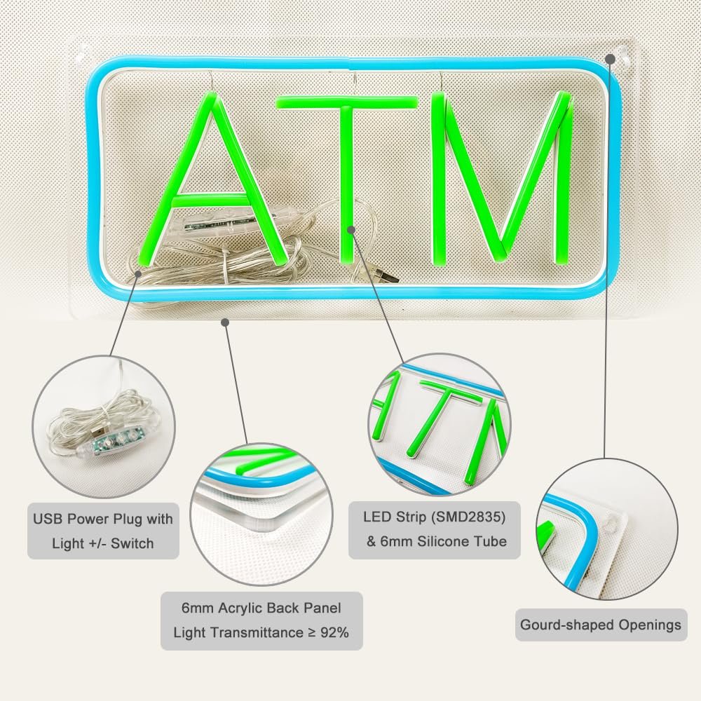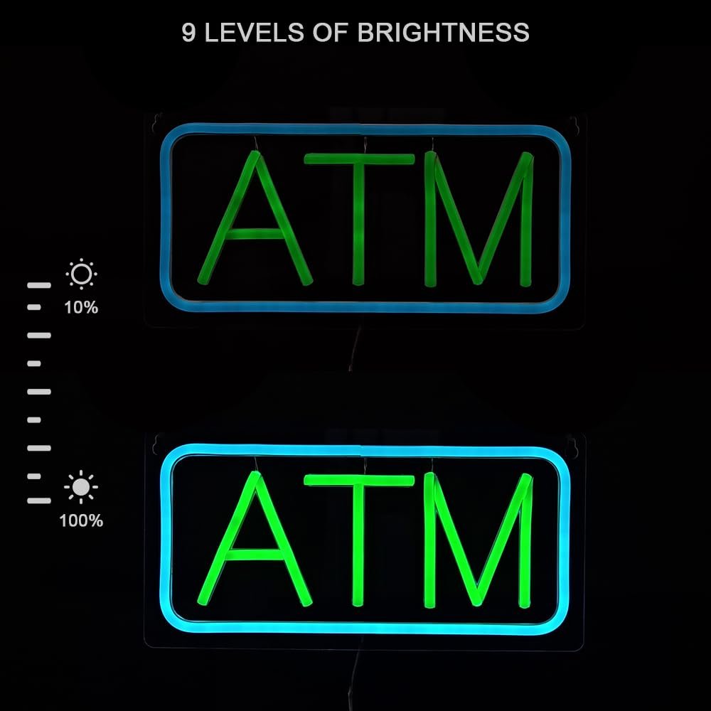 - ใSuper BrightใThis ATM LED Neon Sign is bright and eye-catching, suitable for banks, gas stations, shopping malls, supermarkets and convenience stores. Make your business stand out from the competition and attract potential customers.