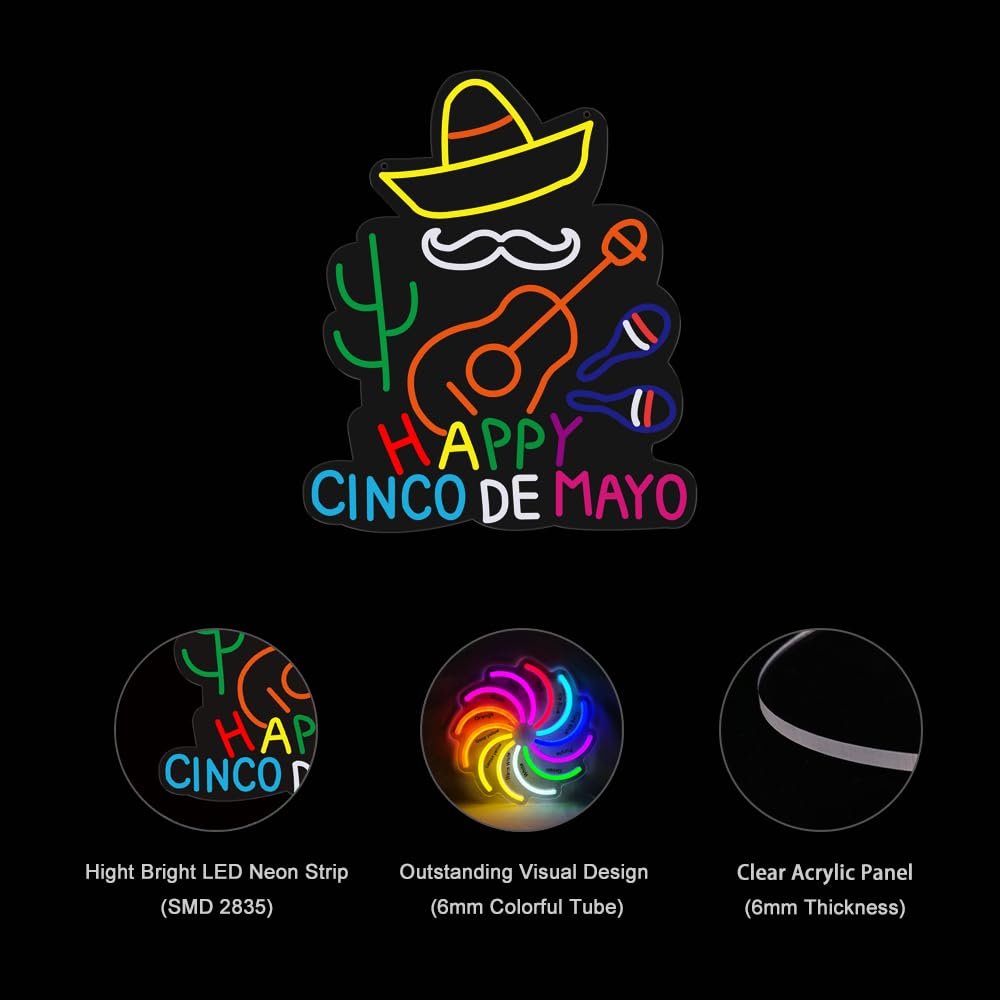 • ใ€Vibrant Cinco de Mayo Decorใ€‘Illuminate your space with this festive “Happy Cinco de Mayo” neon sign. Perfect for adding a lively and colorful touch to your home, bar, or party venue, it’s ideal for Cinco de Mayo celebrations, Mexican-themed events, and fiesta gatherings. This eye-catching decor piece brings the spirit of Mexico to your festivities, creating a joyful and memorable atmosphere for all your guests.