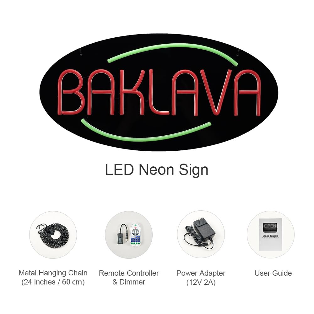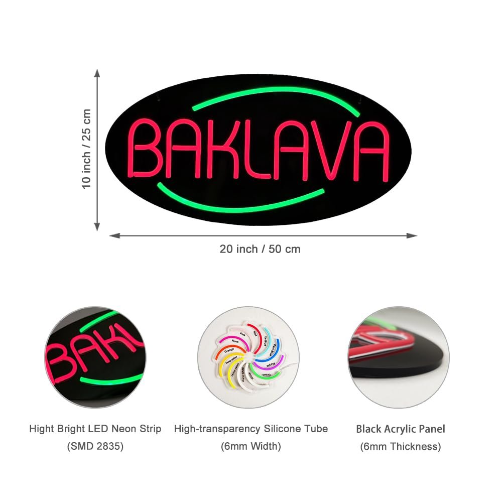 - ใAttention-GrabbingใThis LED Baklava Neon Sign is bright and eye-catching, suitable for Greek Bakery, Arabian Cafรฉ, Tea House/Cafรฉ, Food Expo/Festival, Arabian Specialty Store and so on. Make sure your business stands out from the competition and attracts potential customers.