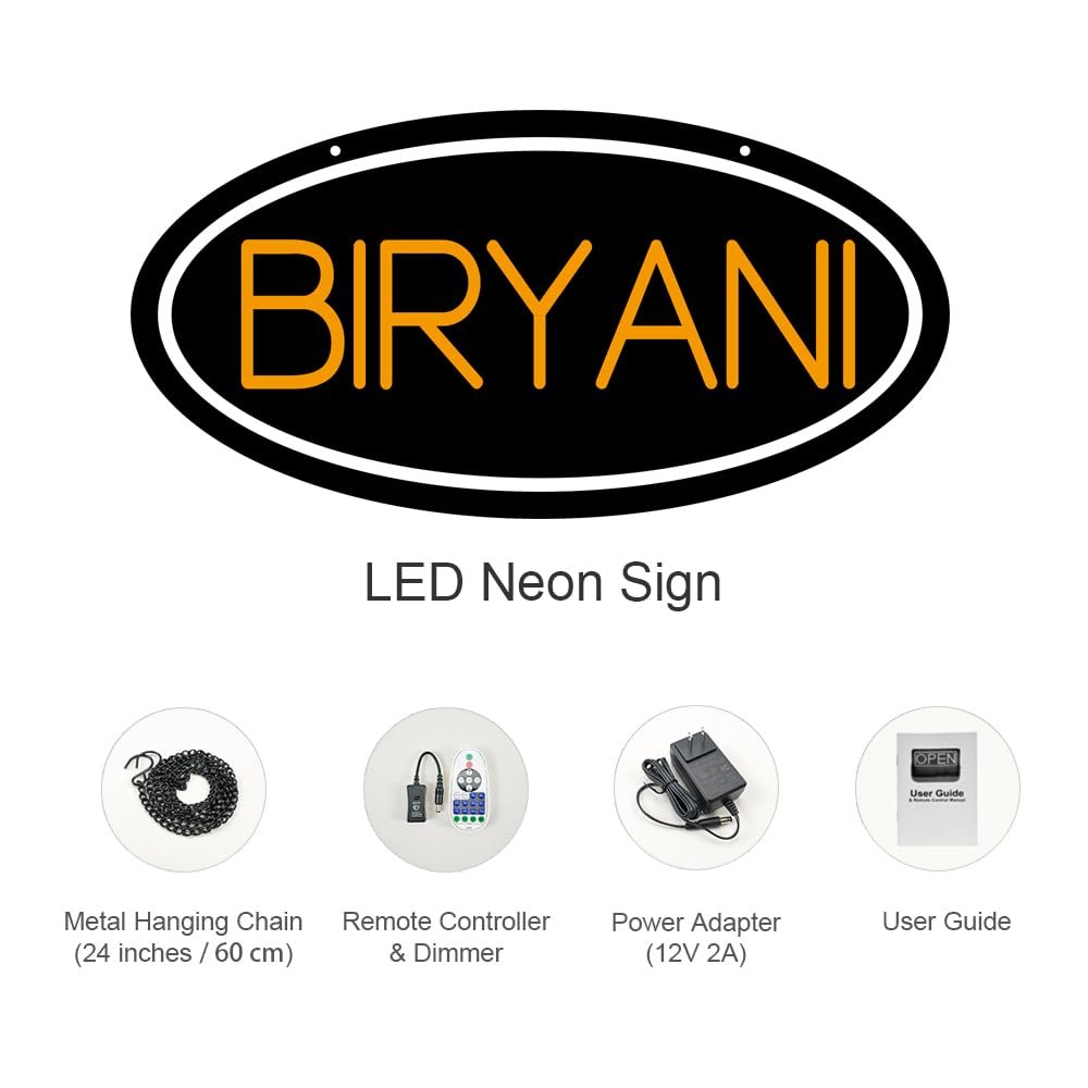 - ใAttention-GrabbingใThis LED BIRYANI Neon Sign is bright and eye-catching, suitable for Indian Restaurant, Pakistani Restaurant, Takeout Biryani Shop, Halal Restaurant, Food Court Stall/Mall Kiosk, Biryani Cloud Kitchen, Biryani&Curry House, Tiffin Service / Meal Box Business and so on. Make sure your business stands out from the competition and attracts potential customers.