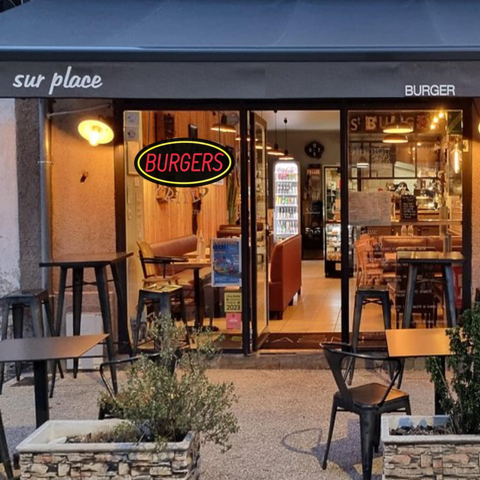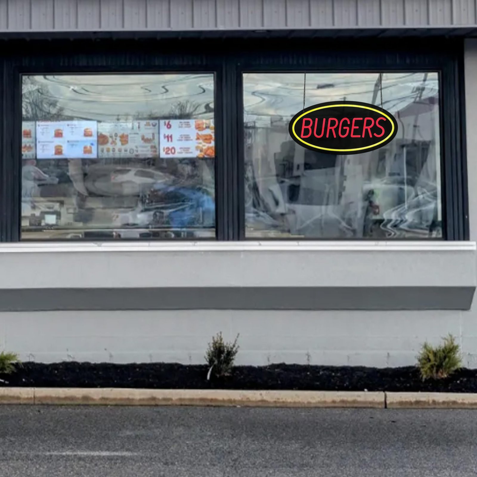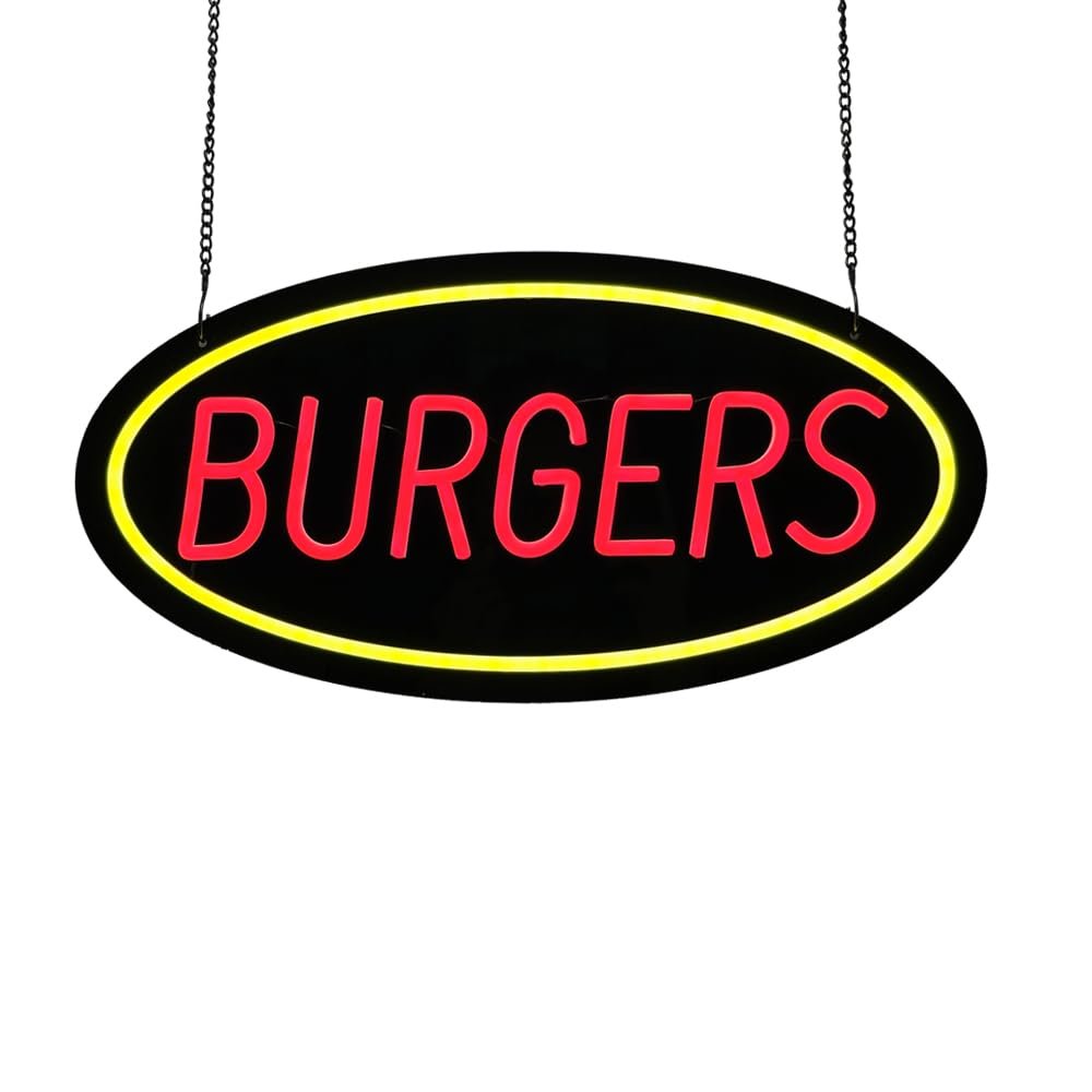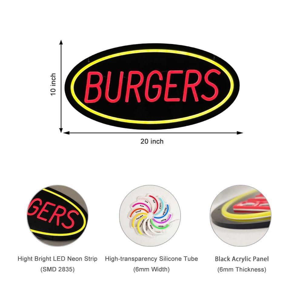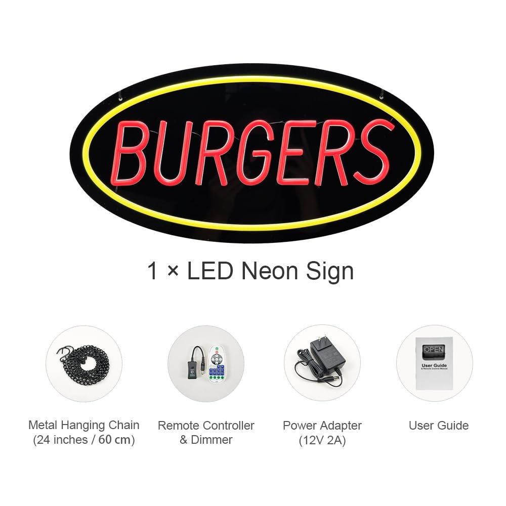 - ใAttention-GrabbingใThis LED Burgers Neon Sign is bright and eye-catching, suitable for burger shops, fast food restaurants, diners, snack bars, takeout restaurants, food trucks, cafรฉs, and casual dining places. Make sure your business stands out from the competition and attracts potential customers.