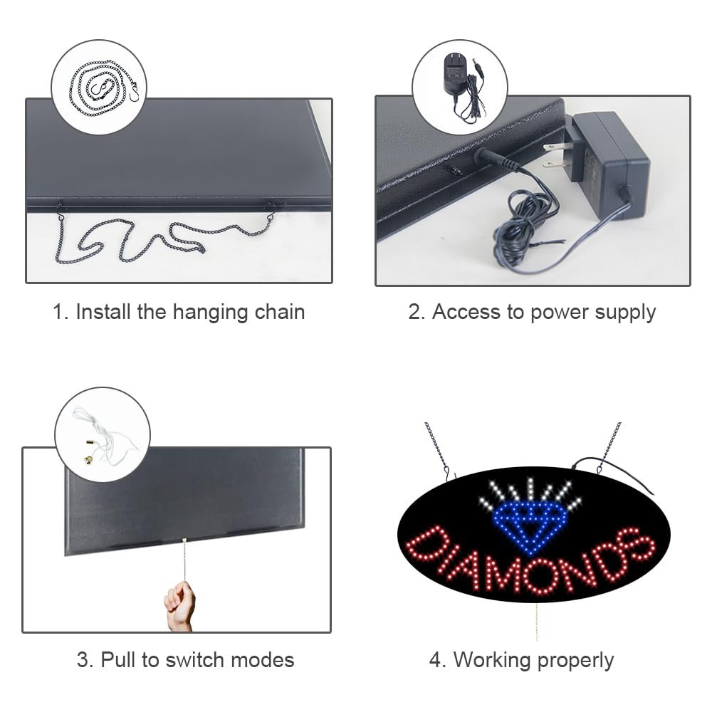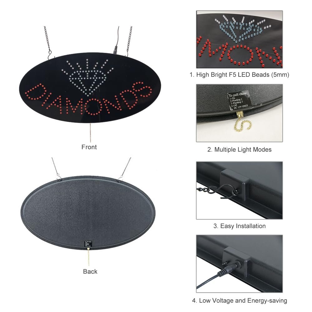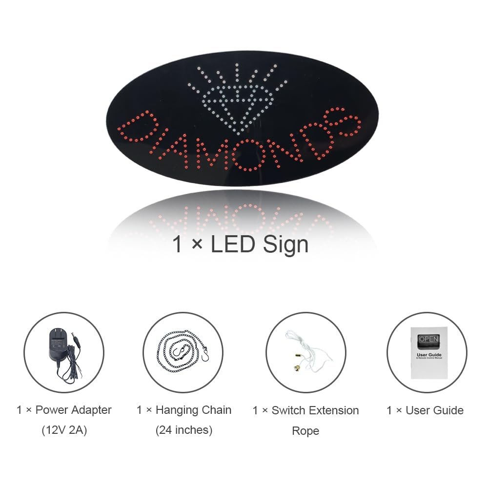 - ใAttention-GrabbingใThis LED DIAMONDS Sign is bright and eye-catching, suitable for jewelry store, diamond shop, gold exchange, and luxury boutique. Ensure your business stands out from the competition and attracts potential customers.