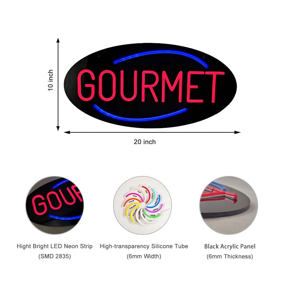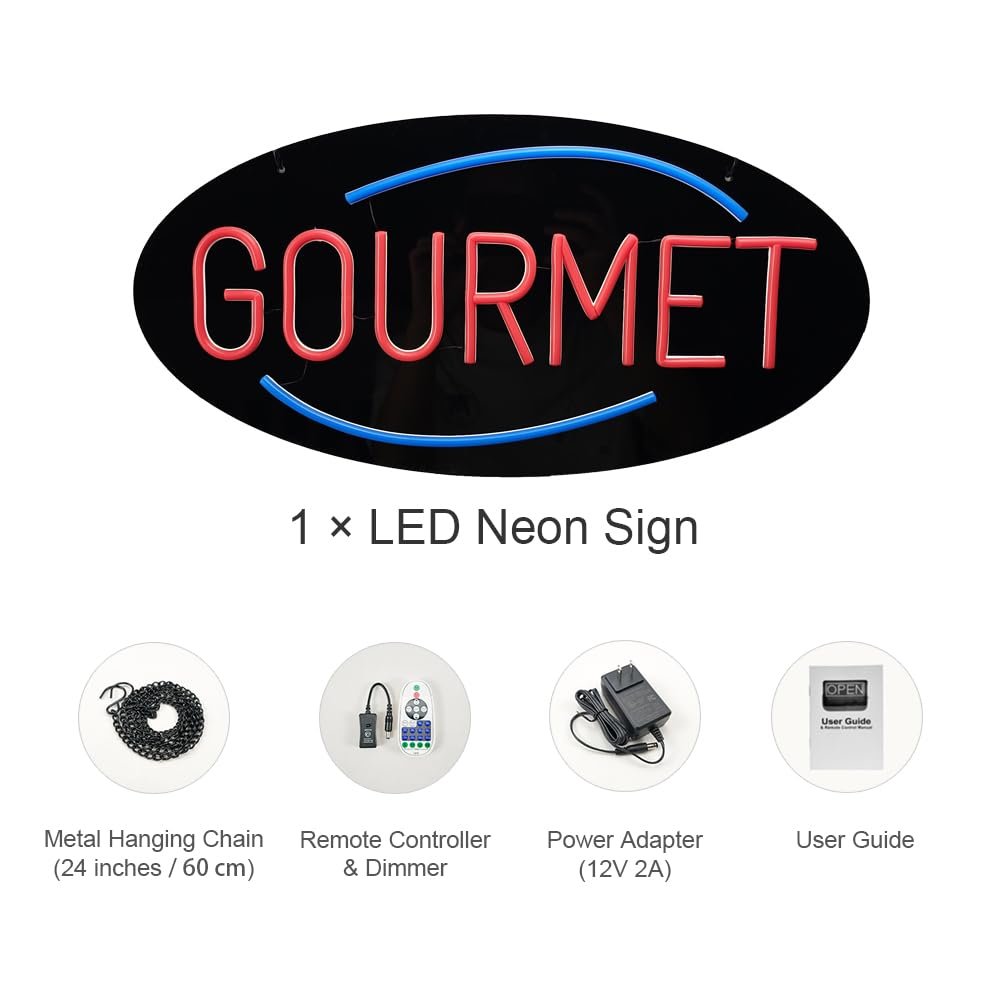 - ใAttention-GrabbingใThis LED Gourmet Neon Sign is bright and eye-catching, suitable for Specialty Food Store, Artisan Food Market, Gourmet Dining Spot, Upscale Bistro, Dessert Lounge, Wine & Cheese Shop, Gourmet Wine Store, Cheese Boutique, Farmers’ Market Stall, Meal Prep Service Shop, Catering Business Sign, Pop-Up Gourmet Stall, Gourmet Cooking Class, Boutique Gourmet Shop for Tourists and so on. Make sure your business stands out from the competition and attracts potential customers.
