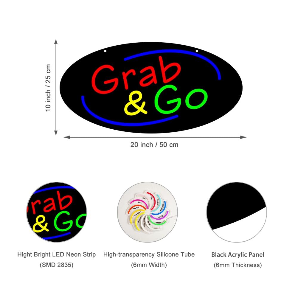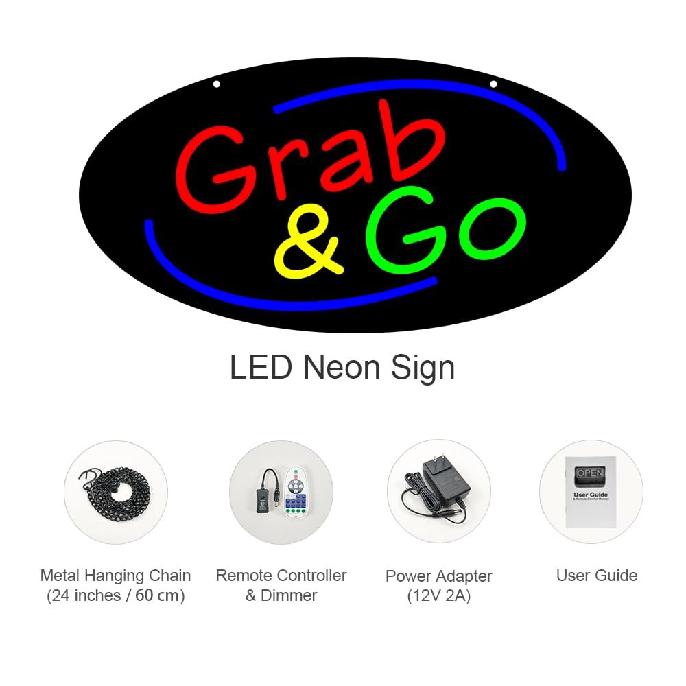 - ใAttention-GrabbingใThis LED Grabs Go Neon Sign is bright and eye-catching, suitable for Convenience Store, Cafรฉ, Deli, Juice Bar, Airport, Health Bar and so on. Make sure your business stands out from the competition and attracts potential customers.