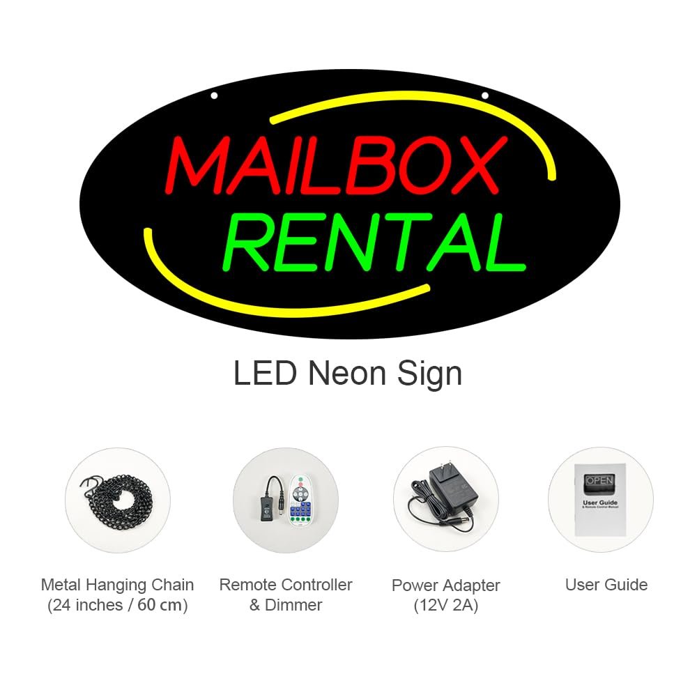 - ใAttention-GrabbingใThis LED MAILBOX RENTAL Neon Sign is bright and eye-catching, suitable for Shipping and Mail Center, Private Postal Service Store, Copy and Mail Store/Print&Mail Services Store, Independent Postal Retailer and so on. Ensure your business stands out from the competition and attracts potential customers.