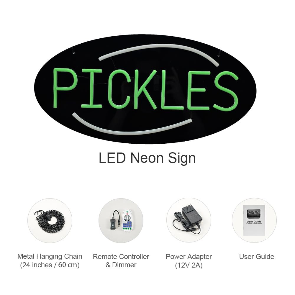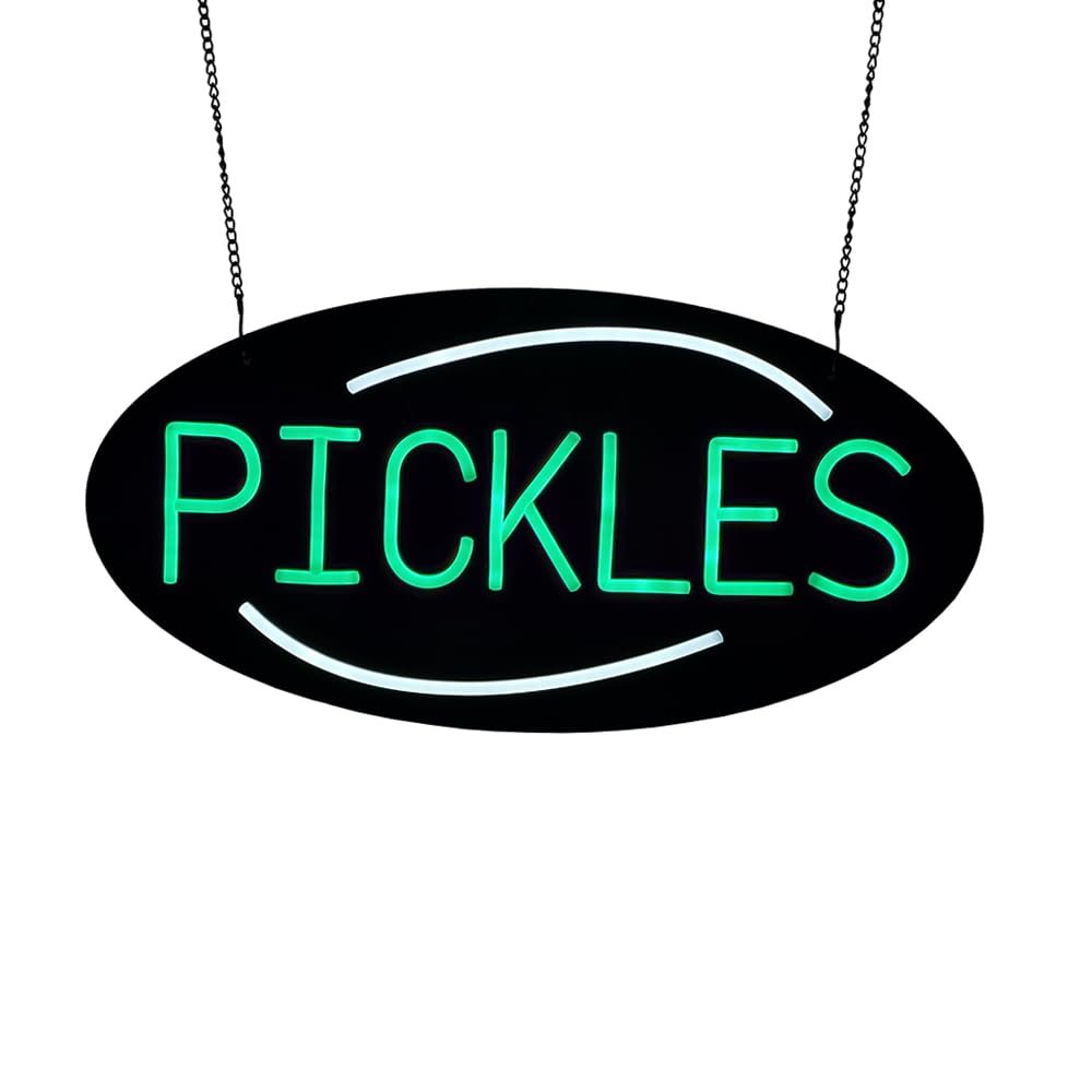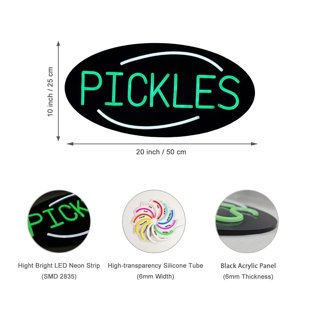 - ใAttention-GrabbingใThis LED Pickles Neon Sign is bright and eye-catching, suitable for Deli, Farmers Market Stand, BBQ Restaurant, Snack Cart, Gourmet Food Shop, Pickle Gift Shop, American Diner, Vegan or Health Food Store and so on. Make sure your business stands out from the competition and attracts potential customers.