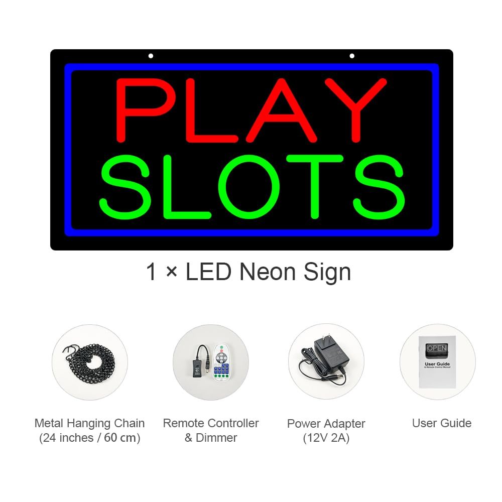 • ใ€Attention-Grabbingใ€‘This LED PLAY SLOTS Neon Sign is bright and eye-catching, suitable for Slot Machine Arcade, Gaming Lounge, Adult Game Room, Video Gaming Cafรฉ, Bar with Slots, Truck Stop Casino, Mini Casino, Sports Bar & Casino, Resort Casino, Club Gaming Room, Internet Cafรฉ with Slots and so on. Make sure your business stands out from the competition and attracts potential customers.