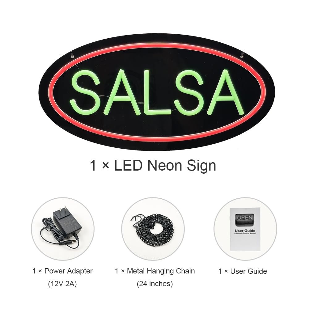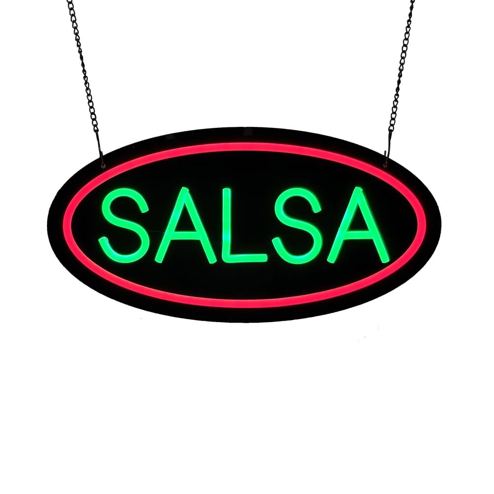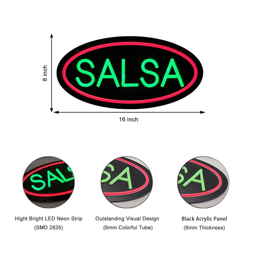 - ใAttention-GrabbingใThis LED Salsa Neon Sign is bright and eye-catching, suitable for Tex-Mex Restaurants, Fast-Casual Mexican Food Outlets, Taco Stands, Catering Services, Food Trucks, Grocery Stores, Specialty Food Stores, Snack Bars or Food Courts and so on. Make sure your business stands out from the competition and attracts potential customers.